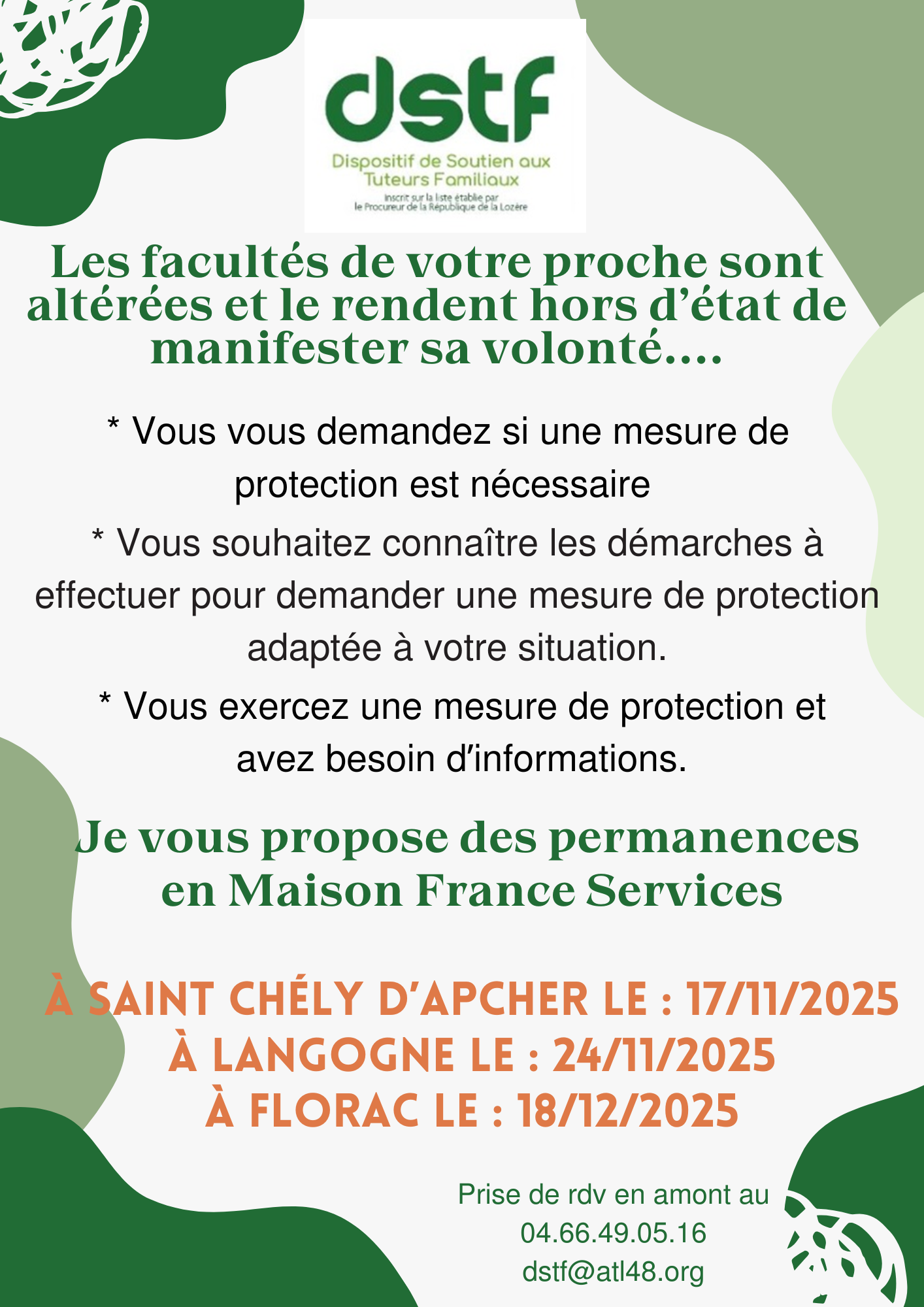 Cette action d’information était réalisée en partenariat avec le service des majeurs du Tribunal Judiciaire de Mende. Lorsque les Juges des Contentieux de la Protection nommaient un proche pour exercer la mesure de protection, les Greffières communiquaient une plaquette de présentation du DSTF et le calendrier des sessions d’information et de conseils pratiques, pour l’année.